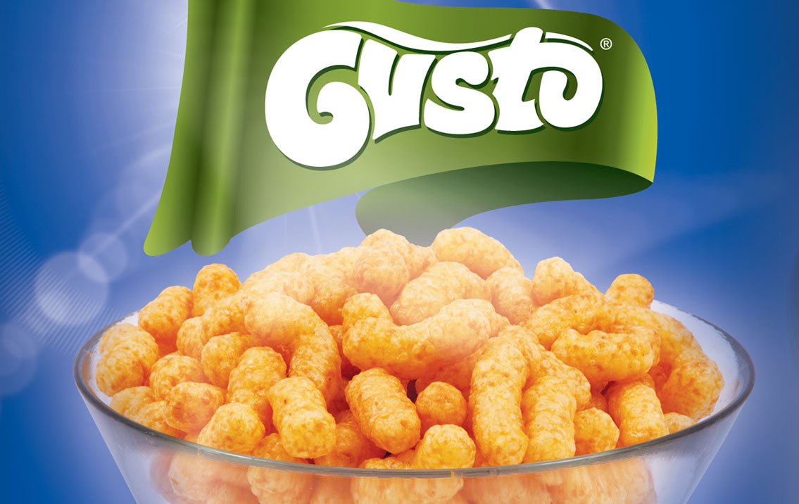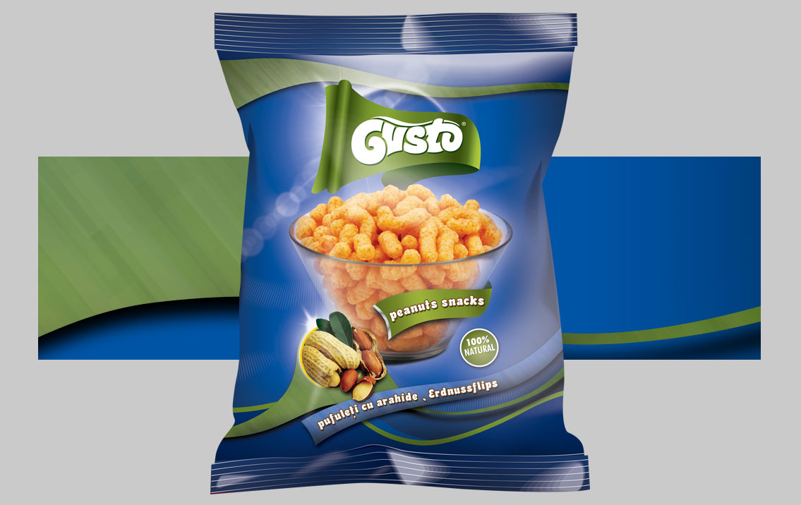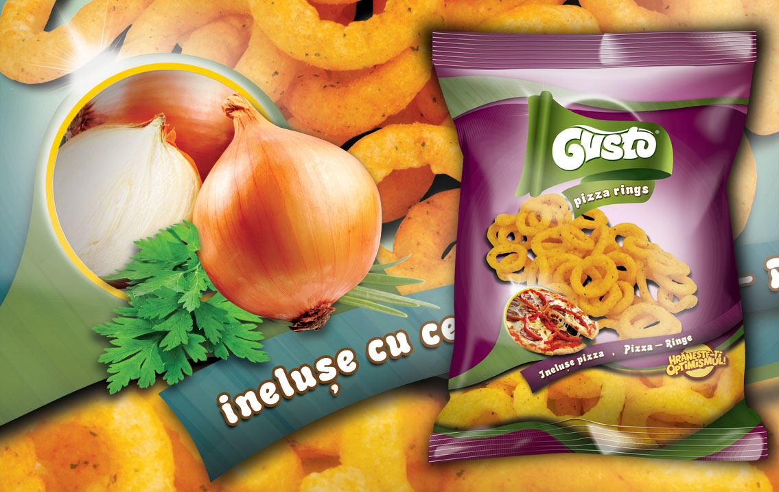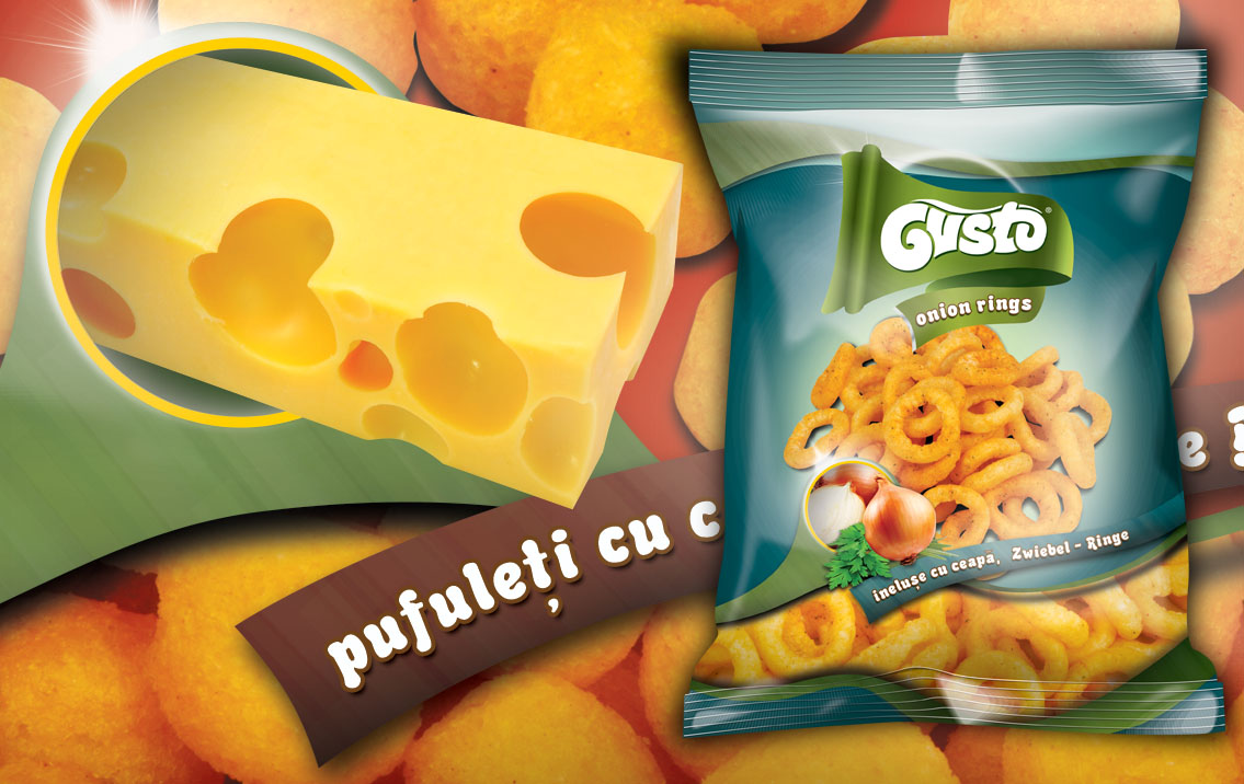 Create the packaging design for a range of four different snack shapes and aromas : onion rings, peanuts snacks, chees balls and pizza rings. The client wished for a cheerful, yet simple palette, that holds the corn puffs in the center of attention, and makes sure the aromas match the design of each bag.